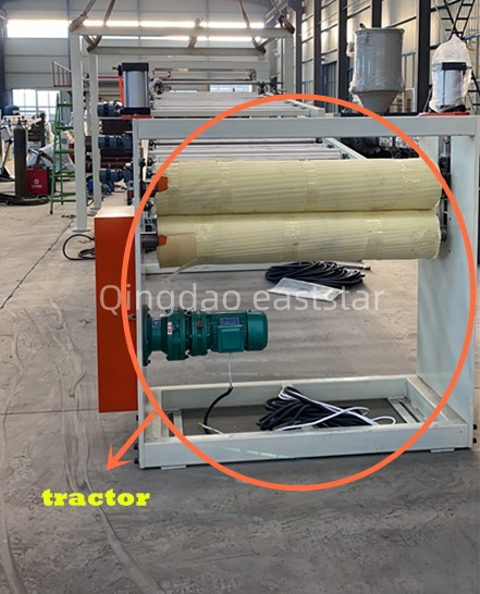 整條多層共擠生產(chǎn)線還包含兩臺液壓換網(wǎng)器、8米冷卻托架和牽引裁斷系統(tǒng)。換網(wǎng)器采用臺灣液壓元件,實(shí)現(xiàn)不停機(jī)換網(wǎng)。牽引機(jī)配備Φ240×2500mm丁腈膠輥,通過2.2KW電機(jī)驅(qū)動,實(shí)現(xiàn)與三輥的同步調(diào)速。ABS共擠板材設(shè)備的電控系統(tǒng)采用西門子S7系列PLC和觸摸屏,配合ABB變頻器,確保整線協(xié)調(diào)運(yùn)行。